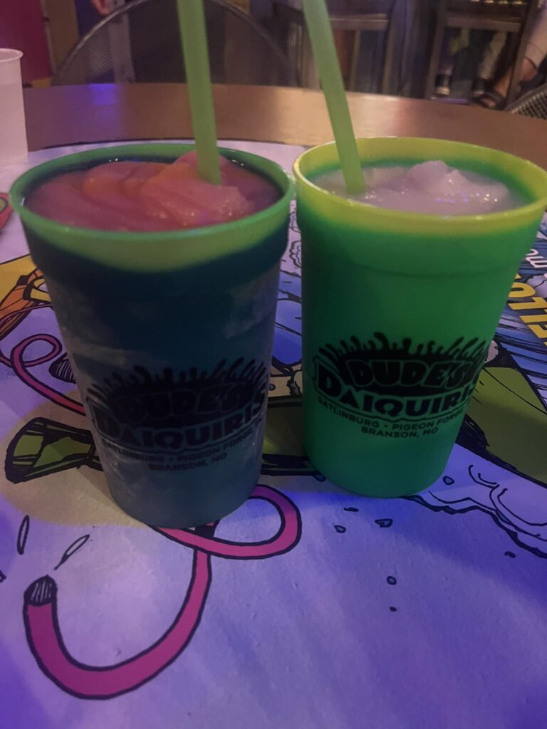 - The DINKs’ can’tt resist popping into Mellow Mushroom for a round of frozen daiquiris. The real kicker? Michelle’s in-laws have held onto their souvenir cup in their RV, and they proudly use it every time they come back to Pigeon Forge for a great discount on the Daquiris. If you haven’t had their pizza it’s good as well.